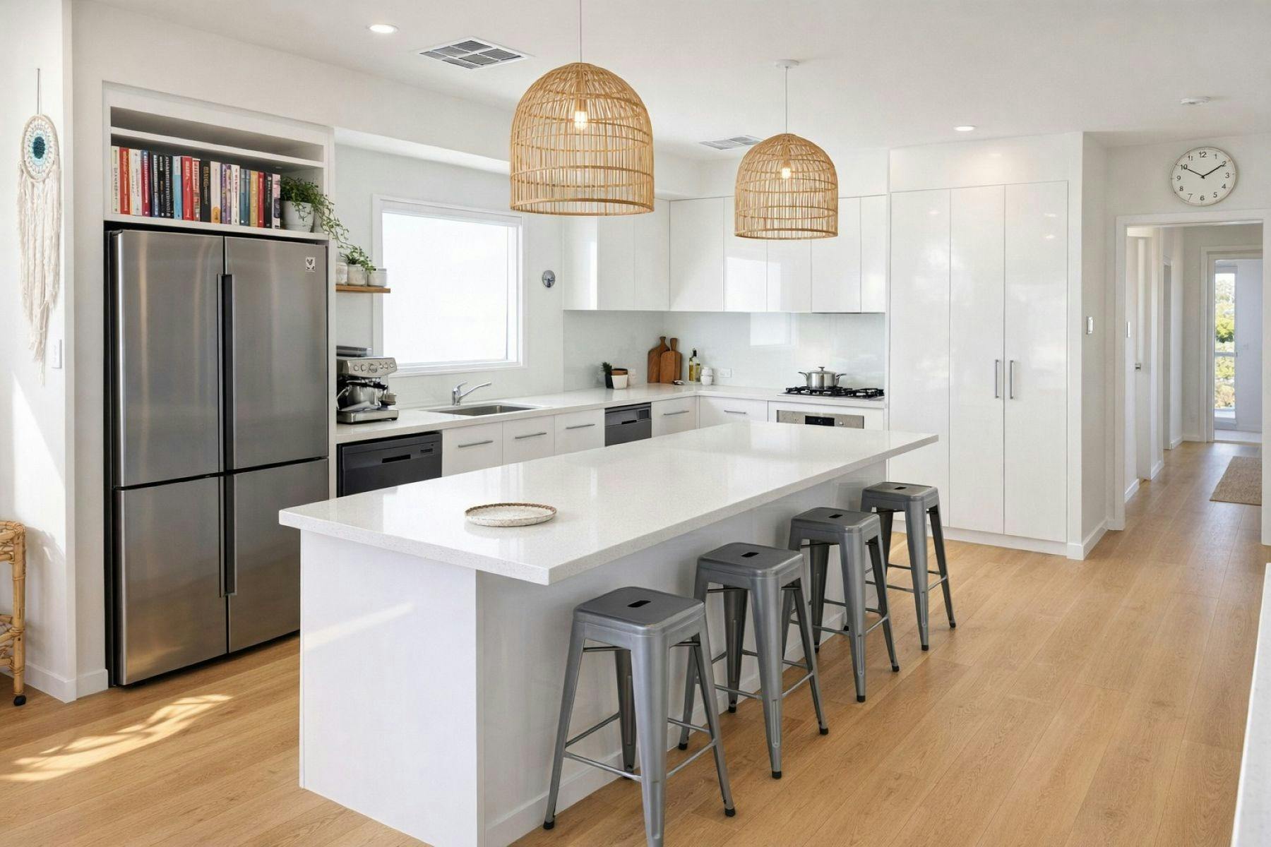 With two generous living zones across separate levels, there’s room for everyone to spread out and settle in. Send the kids downstairs for movie nights and table tennis tournaments while the adults gather upstairs for sunset drinks on the balcony, overlooking coastal scrub with glimpses of the coastline. When it’s time to come together, the expansive open-plan living and dining areas create the perfect setting for long, laughter-filled meals.