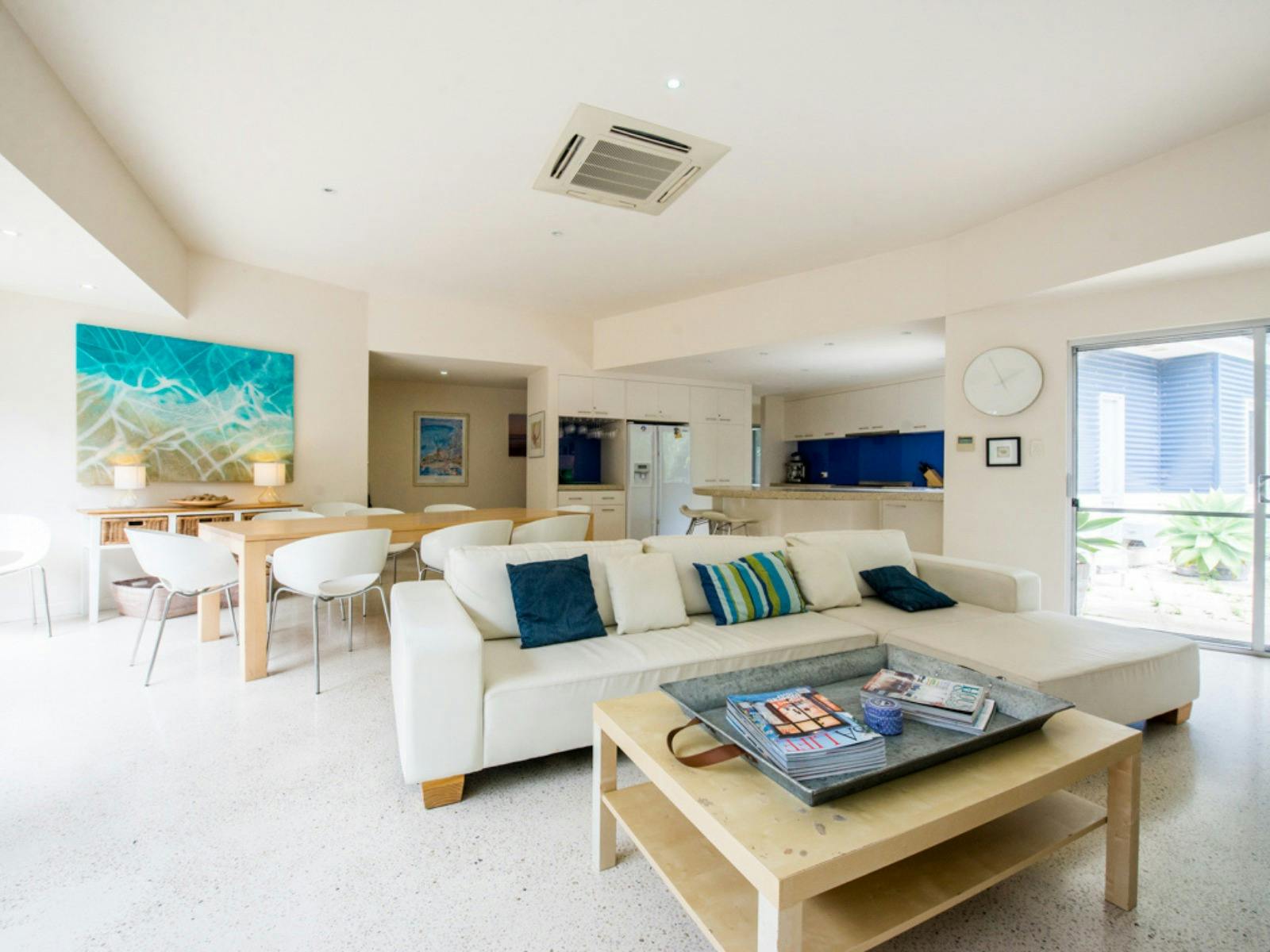 Guests will be saying WOW as they enter the striking open plan living area, dining and kitchen. The designer kitchen includes a commercial Smeg oven, cook top and range hood, a fridge with ice and water dispenser and an Nespresso machine (please bring coffee pods).