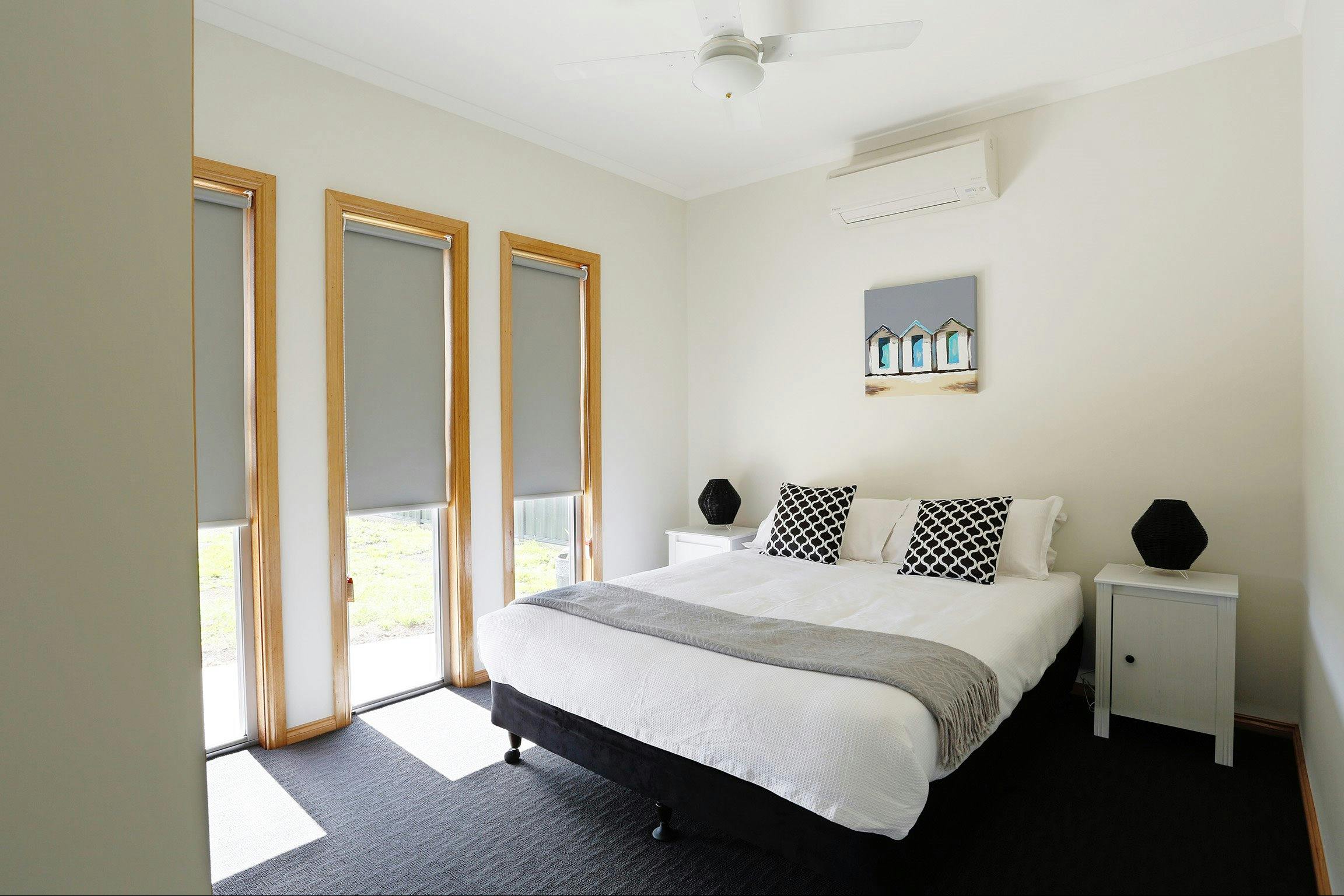 Open plan living area with large north-facing, floor-to-ceiling windows, letting in plenty of light and warmth. Contains a Split system air conditioner, Smart TV, Blu-ray DVD player, DVD’s, Wii and games. High-quality linen and towels as well as an ensuite bathroom with double shower heads.