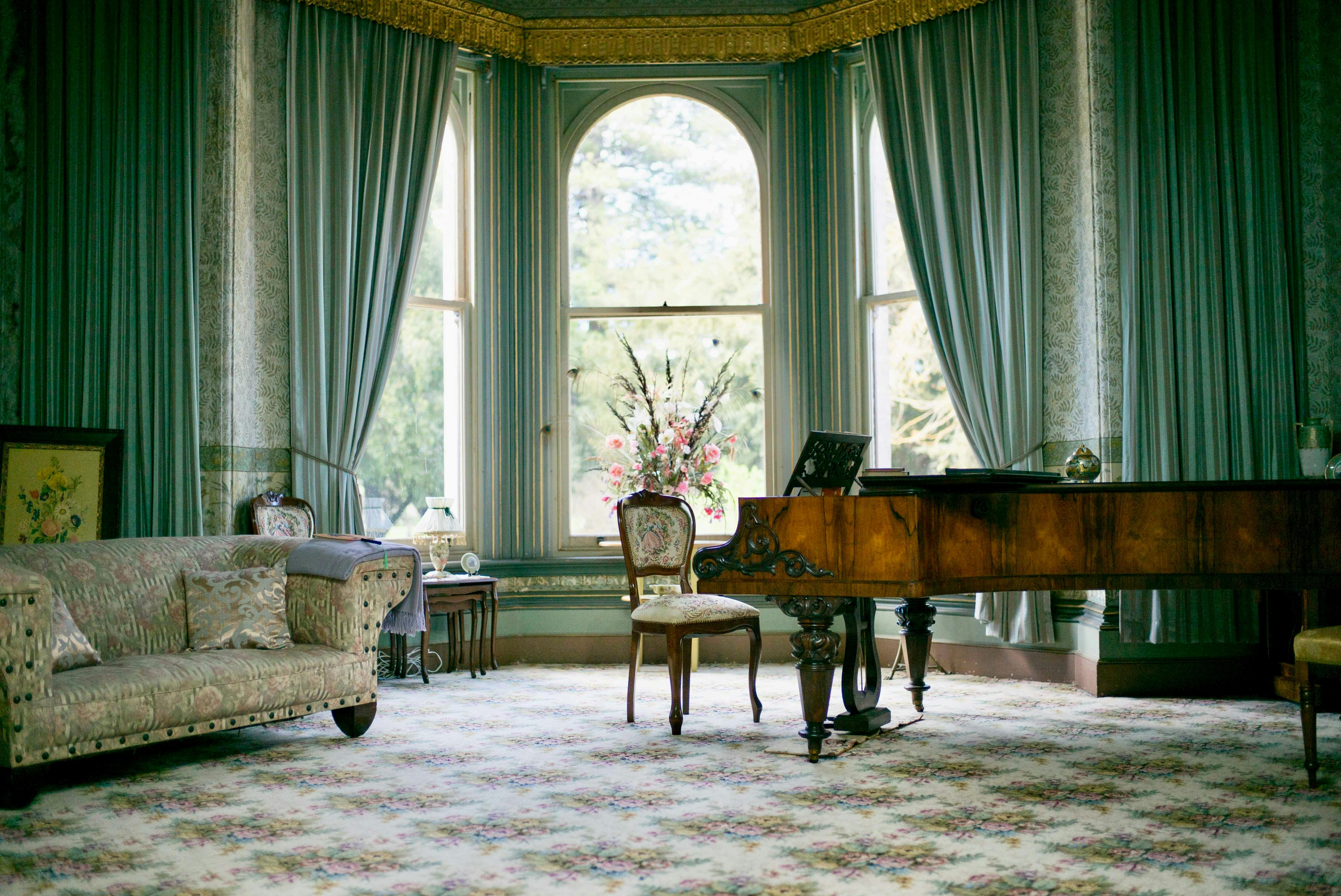 Original wallpapers, gasoliers, acid-etched and stained glass windows, Italian marble mantle pieces, gold leaf cornices, antique furniture and a number of extremely old pieces of glass, porcelain, silver and brass are some of the features. All decorations date from 1879. The garden, established in 1880, is planted with trees from all regions of the world.